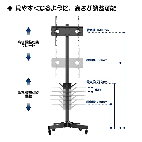 完璧な視野角を見つけるように、テレビスタンド+15°/-15°にチルトできます。高さは800mmから1500mmまでに調整可能です。メディア棚板も付きます。棚板の
