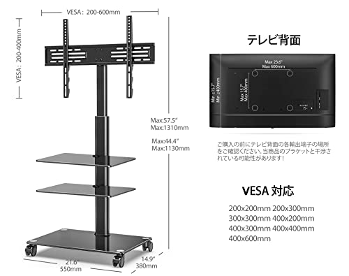 【VESA規格対応】汎用性の高いVESA規格(テレビ背面のネジ穴間の距離)対応、最小限は20×20cm、最大限は60×40cmです。当製品が32~60インチのテレビやモニターに適応します。