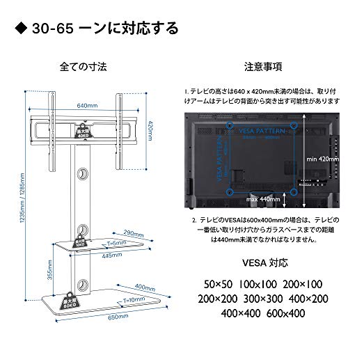 テレビスタンド対応されるVESA規格の最大限は600mmx400mmですけど、50mmx50mm、100mmx100mm、200mmx100mm、300mmx300mmなどにも対応します。VESAはテレビ背面にある取り付けネジ穴間の距離です。鉄と強化ガラスで作られます。耐荷重は40kgで、30-65インチの液晶テレビ(LCD/LED/PLASMA)に適合します。日本語説明書が付属されています。