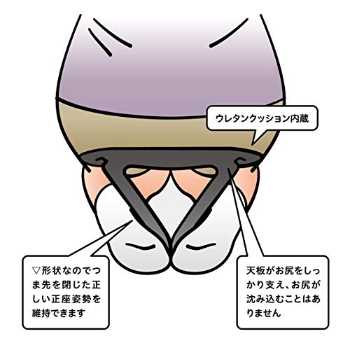 爪先を閉じた美しい姿勢が保たれ、背筋も自然に伸びます。深く座れば本体は殆ど隠れます。正座が苦手な方も長時間の正座が楽になります。