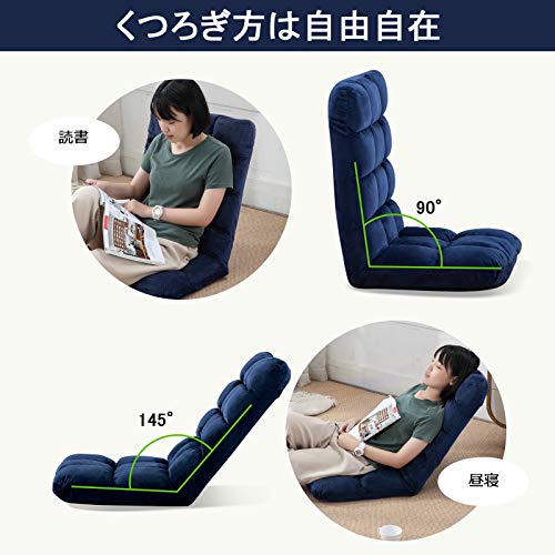 【幅広い座面&ハイバック】ハイバック仕様なので頭までゆったり預けることができます。読書やテレビの視聴、横になっての昼寝等、くつろぎ方は自由自在。幅49cm、長さ最大110cmのコンパクトなサイズで、座椅子又はフロアソファーとして使用してもモコモコで座り心地良いです。書き物や食事をする時はもちろん、TVを見る時でも欲しい角度が見つけやすいです。また、柔らかな色合いが落ち着いた雰囲気を、インテリアとして