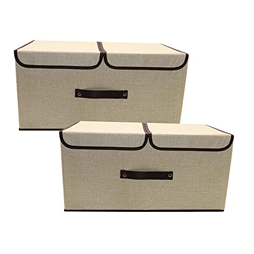 ふた・仕切り付き マルチ収納ケース 折りたたみ可能 リネン 小物 おもちゃ 整理 衣類収納ボックス (ベージュ,