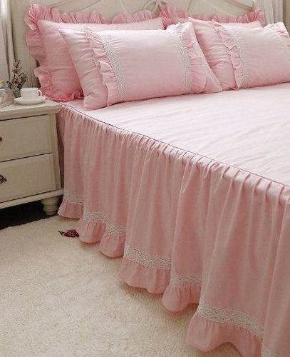 可愛いホワイトレース ピンクのフリルベッドスカート シングル コットン