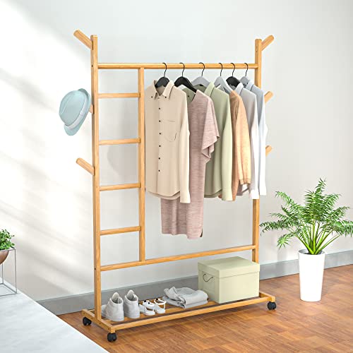 KOOPRO ハンガーラック 帽子掛け おしゃれ 着物 洋服 収納 天然竹製 キャスター付き スリム 頑丈 ズボン 服かけ