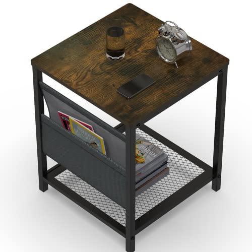 ANYHI サイドテーブル 収納付きメッシュ棚 ナイトテーブル 本棚 マガジンラック ソファー横 スチールフレーム