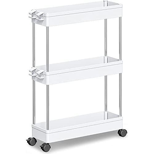 SPACEKEEPER キッチンワゴン 3段収納カート プラスチック製 キャスター付き バスケットラック 隙間収納 フック