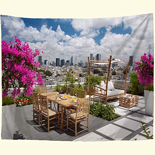 東宝 タペストリー 都市風景(横幅150cm×縦幅100cm)北欧風 ベランダ 屋上庭園 バルコニー景色 海浜リ