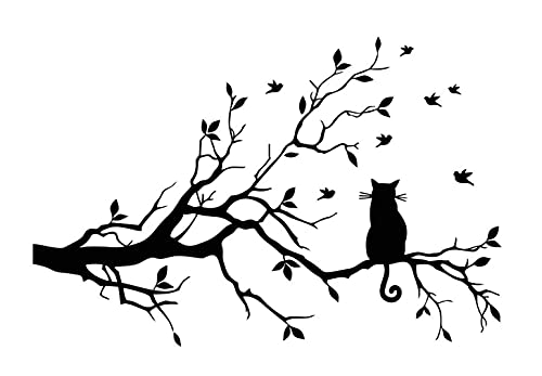 Chirstseason ウォールステッカー 猫 モノクロ 黒 モダンアート 木に乗る黒猫 鳥 インテリア キッチン リビング