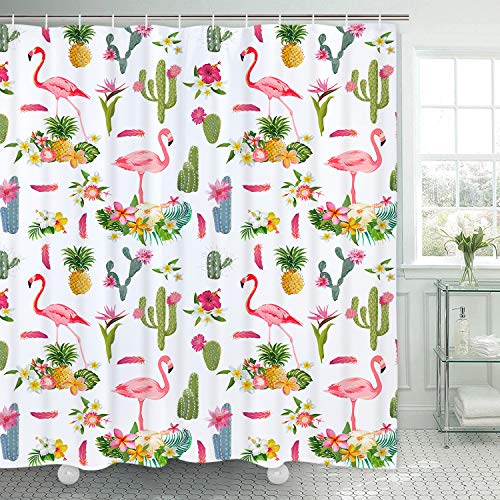 Pknoclan カラフルなシャワーカーテンフック付き 175 x 178cm 可愛い フラミンゴバスカーテン 熱帯植物 カクタス