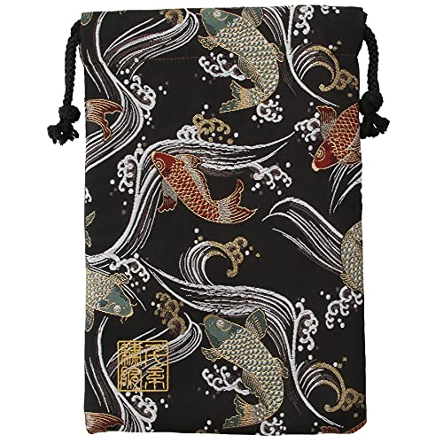 千糸繍院 西陣織 金襴 巾着袋(裏地付き) 黒泳鯉 中サイズ